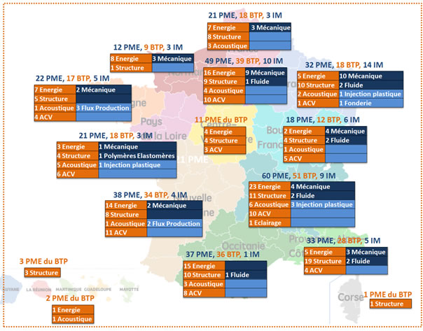 SiMSEO, au travers de ces 360 clients, recensent les besoins techniques, région par région, dans les deux domaines ciblés : le BTP et l’Industrie Manufacturière. La carte ci-dessous illustre, pour les 13 régions et les 2 DROM de France, les besoins métiers prépondérants et exprimés au travers des 360 PME clientes. Cette cartographie « besoin métier / région » donne une bonne indication des besoins de la profession du BTP et de l’Industrie Manufacturière, exprimés au travers des 360 PME accomapgnées. On notera tout de même une très forte dynamique pour la région Auvergne Rhone-Alpes et l’Ile de France. |