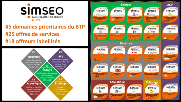En étroite collaboration avec le PTNB, UNSFA, CINOV, ADN, CAPEB, et la FFB, SiMSEO a déployé 25 offres de service de simulation numérique dédiées au bâtiment pour les architectes et les bureaux d’études. Ces offres de service, intégrant diagnostic, réalisation de projets pilotes, logiciels, et formations à l’usage, sont centrées autour de 5 domaines prioritaires : Structure, Energie, Acoustique, Eclairage, ACV (Analyse du cycle de vie)