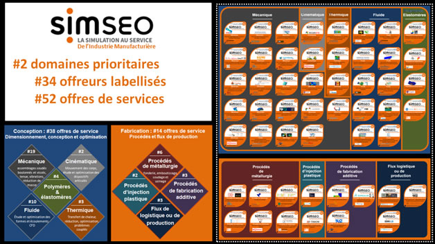 « Les offres de service sectorielles » permettent d’assurer l’accès aux outils de simulation numérique et à la réalisation d’études, avec un accompagnement adapté. Les pouvoirs publics soutiennent financièrement les sociétés faisant appel à ces prestations avec un abondement pouvant atteindre 50% des prestations, plafonné à 10 K€. SiMSEO a déployé 77 offres de service métiers, adaptées à deux secteurs prioritaires :
