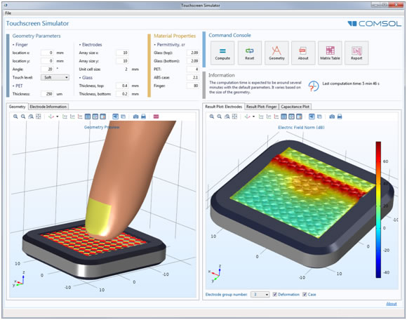 | Application de simulation basée sur un modèle d'écran tactile capacitif. L'utilisateur peut contrôler la position et l'orientation d'un doigt qui appuie sur l'écran tactile, puis calculer la matrice de capacitance. |