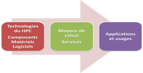 Des entités comme l’infrastructure de calcul pan-européenne PRACE , ou tout centre de calcul institutionnel ou privé qui met en œuvre les technologies du HPC et donne accès à des moyens de calcul et à des services associés (centre de calcul communautaire, grand industriel possédant des supercalculateurs, plateforme commerciale de service ou de cloud etc.) font partie du deuxième pilier. Les applications et usages forment le troisième pilier, où l’on trouve tous les utilisateurs du monde de la recherche et de l’industrie pour lesquels la simulation numérique et le calcul intensif sont un outil de plus en plus indispensable.