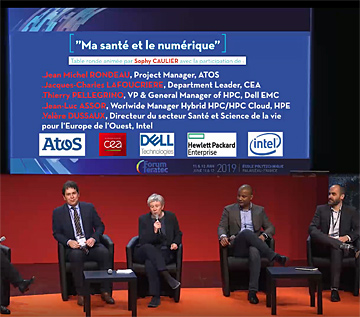A new feature of this 14th edition of the Teratec Forum, as the morning plenary sessions closed with a roundtable on the theme “My Health and Digital Technology”, moderated by journalist Sophy Caulier. She received: Jean Michel Rondeau, Project Manager, Atos; Jacques-Charles Lafoucrière, Department Leader, CEA; Thierry Pellegrino, VP & General Manager of HPC, Dell EMC; Jean-Luc Assor, Worldwide Manager Hybrid HPC/HPC Cloud, HPE; Valère Dussaux, Health and Life Sciences Sector Director for Western Europe, Intel.