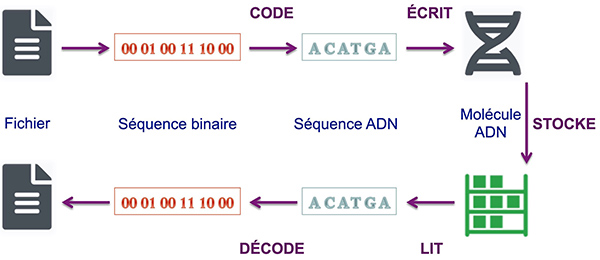 En effet, les centres de données stockent les mégadonnées numériques sur disques durs et bandes magnétiques qui sont recopiés tous les 5-7 ans ; ils représentent des "gouffres" pour les ressources en terrain, électricité et matériaux rares. En comparaison, le stockage à l’échelle moléculaire, sur un polymère tel que l’ADN, permettrait une densité supérieure d’un facteur dix millions, une conservation prolongée d’un facteur dix mille, pour une consommation électrique quasi-nulle. Les technologies requises existent. Cependant, pour devenir économiquement viables pour l'archivage de l'information, ces technologies nécessitent encore des progrès qui verront le jour sous 3-20 ans