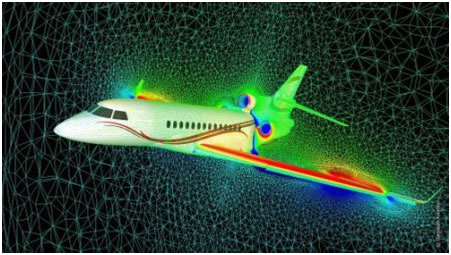 Flow around a business jet aircraft with complex shock-boundary layer interaction, as captured in a section through the CFD unstructured mesh. © Dassault Aviation