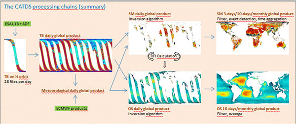 Summary diagram of the Satellite Data Processing Channels of CATDS, Soil Moisture and Ocean Salinity |