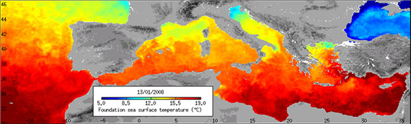 Surface temperature in the Mediterranean: High-resolution image obtained by multi-sensor mixing (2 km resolution)