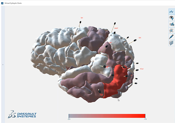 The EPINOV project is currently evaluating this approach through a multicentric randomized clinical study, involving 13 neurosurgical centers in France. Dassault Systèmes is developing a simulation pipeline based on medical data that estimates the value of epileptogenicity according to the cortical region. The Living Brain simulation results are visualized in a medical platform intended for neurologists and neurosurgeons involved in the surgical decision.
