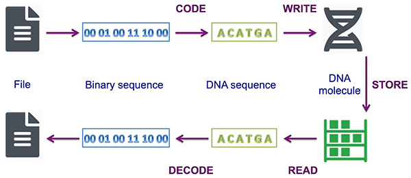 Indeed, datacentres store digital big data on hard disks and magnetic tapes that are copied every 5-7 years; they "devour" resources such as land, electricity and scarce materials. In comparison, storage at a molecular scale, on a polymer such as DNA, would allow for a density of up to ten million times greater, extended longevity by a factor of ten thousand, for virtually zero power consumption. The required technologies exist. However, to become economically viable for information archiving, these technologies still require further progress that will emerge within 3-20 years.
