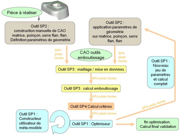 L’optimisation du processus et des outils d’emboutissage permettra également de minimiser la quantité de matière utilisée (gains financiers potentiels pour l’emboutissage, mais aussi gain en termes de transport et de consommation énergétique pour la production de l’acier) La plate forme de calcul est opérationnelle. Elle permet d’effectuer une optimisation de certains paramètres contrôlant la forme de la pièce ainsi que des paramètres du procédé d’emboutissage. Le workflow général est décrit en Yacs/Salomé, il pilote la succession des différents modules intervenant dans l’optimisation de forme de la pièce emboutie.