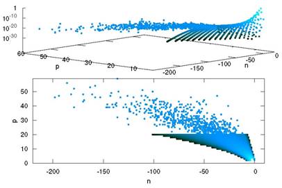 Répartition des tailles d'amas de défauts mixtes (Fe-He) créé par irradiatin. Résultat d'une simulation stochastique couplée à une simulation déterministe.