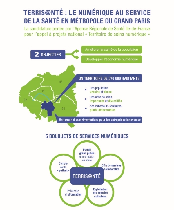 L’Agence Régionale de Santé (ARS) Ile-de-France a choisi pour répondre à l’appel à projets Territoire de soins numérique, le projet TerriS@nté, au coeur de la métropole du Grand Paris, sur le territoire du Nord-Ouest du Val-de-Marne et de l’Ouest du 13ème arrondissement de Paris.