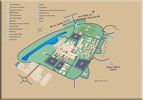 - Take the TransEssonne bus 91.06 (Timetable) and get off at "Les Joncherettes", "Lozère", or "Laboratoires" de l'École Polytechnique.