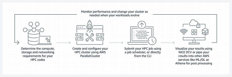 The services listed below as HPC solution components are a great starting point to set up and manage your HPC cluster. AWS constantly releases new services and features, and we strongly encourage you to explore how adjacent cloud services can help you redefine your HPC workflows.