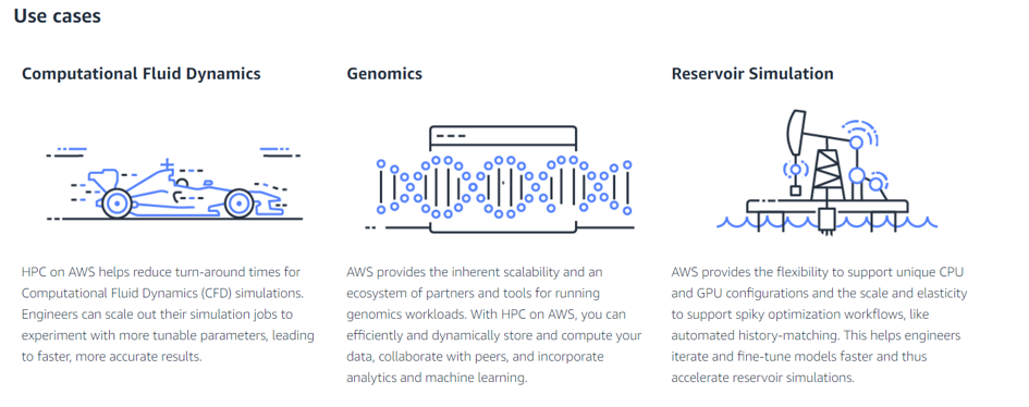 AWS provides the most elastic and scalable cloud infrastructure to run your HPC applications. With virtually unlimited capacity, engineers, researchers, and HPC system owners can innovate beyond the limitations of on-premises HPC infrastructure. AWS delivers an integrated suite of services that provides everything needed to quickly and easily build and manage HPC clusters in the cloud to run the most compute intensive workloads across various industry verticals. These workloads span the traditional HPC applications, like genomics, computational chemistry, financial risk modeling, computer aided engineering, weather prediction, and seismic imaging, as well as emerging applications, like machine learning, deep learning, and autonomous driving.